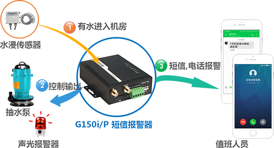 Àý£ºµ±»ú·¿¼à²âµ½ÓÐË®ÇÖÈëºó£¬¶ÌÐű¨¾¯Æ÷¿ØÖÆË®±Ã³éË®£¬²¢ÏòÖµ°àÈËÔ±µÄÊÖ»ú·¢Ëͱ¨¾¯¶ÌÐź͵绰ºô½Ð¡£